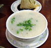 | お粥 | 地元民口コミ情報でいつもお昼には長蛇の列となる【湾仔】のお粥屋さん。【お粥】もおいしいが、【チマキ】もおいしい!地元民のオーダーを見ていると、みなさん【お粥】ともう一品サイドオーダーを頼んでいるのだけど、それがチマキという率、多し。あと多いのは+【焼きそば】(ラーメンとライスっていう感覚?)。ここのひそかな(といっても大きく告知してあるけど)人気商品は【魚の皮】(【笑激的事件簿〜香港】に掲載、ご参照ください)。地元の友人に薦められるままトライしたところ、本当に生の魚の皮だけが山盛りになって出てきた。これは・・・ニオイ消しと思われる薬味(刻みネギ、香辛料、ピーナツ)がたっぷり載っていて醤油で食べる。味は魚の皮の味・・・。お薦めはしません。 湾仔の路地が所在地。【地番:利東街4号】 |